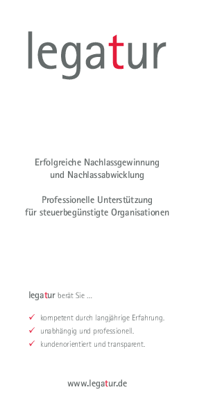 Professionelle Legatakquise und nachfolgende Nachlassabwicklung scheitern jedoch – gerade bei komplexen Lebensverhältnissen potenzieller Legatgeber – häufig an fehlenden zeitlichen und personellen Ressourcen sowie erbrechtlicher Kompetenz in den Organisationen.